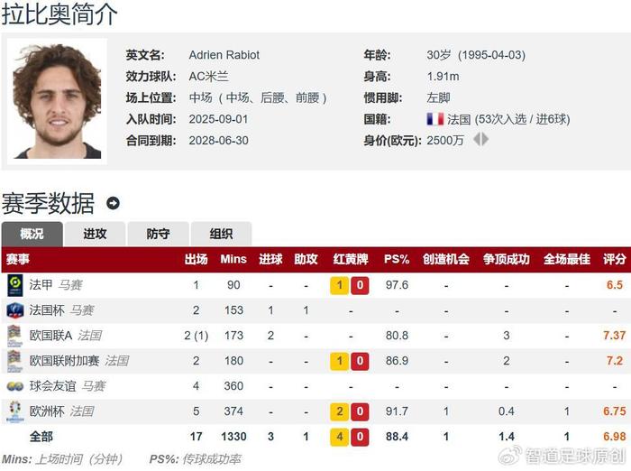 马赛队内打一架,米兰捡了一个漏?官方消息,AC米兰签下马赛30岁的法国中场拉比奥特,双方签约3年,至2028年。据德转数据显示,米兰签下拉比奥特的转会费为900万欧元,而球员在德转的身价为2500万欧元,算是捡漏了。