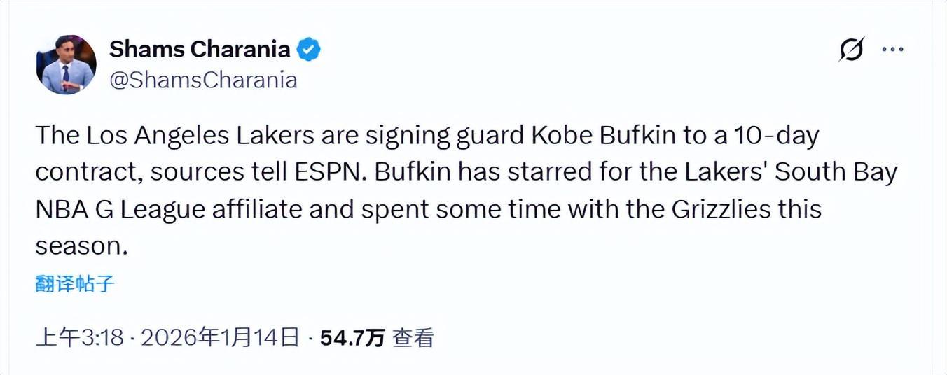 北京时间1月14日,据名记Shams报道,湖人已同意与后卫科比-巴夫金签下一份10天短合同。巴夫金是2023年NBA选秀的首轮15号秀,职业生涯前两个赛季效力于老鹰,休赛期被交易至篮网,随后在2025-26赛季常规赛开打前被篮网方面裁掉。